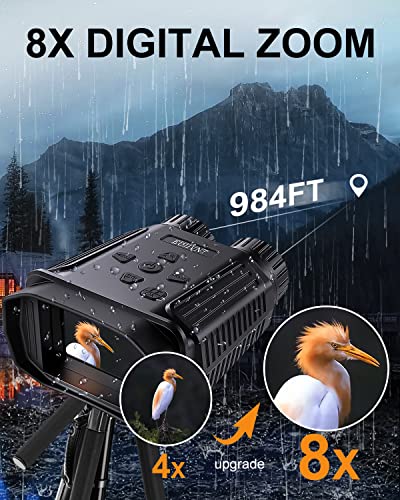 Dieses digitale Nachtsicht-Fernglas verfügt über einen 8-fachen Digitalzoom und einen 2,4 Zoll großen HD-Bildschirm, der erstklassige hochauflösende Bilder (4000 x 3000 Pixel) und FHD-Videos (1920 x 1080 Pixel bei 30 fps) bei völliger Dunkelheit ermöglicht. Die Anti-Shake- und Bewegungserkennungsfunktionen gewährleisten bei der Bedienung eine stabilere und klarere Sicht auf Wildtiere.